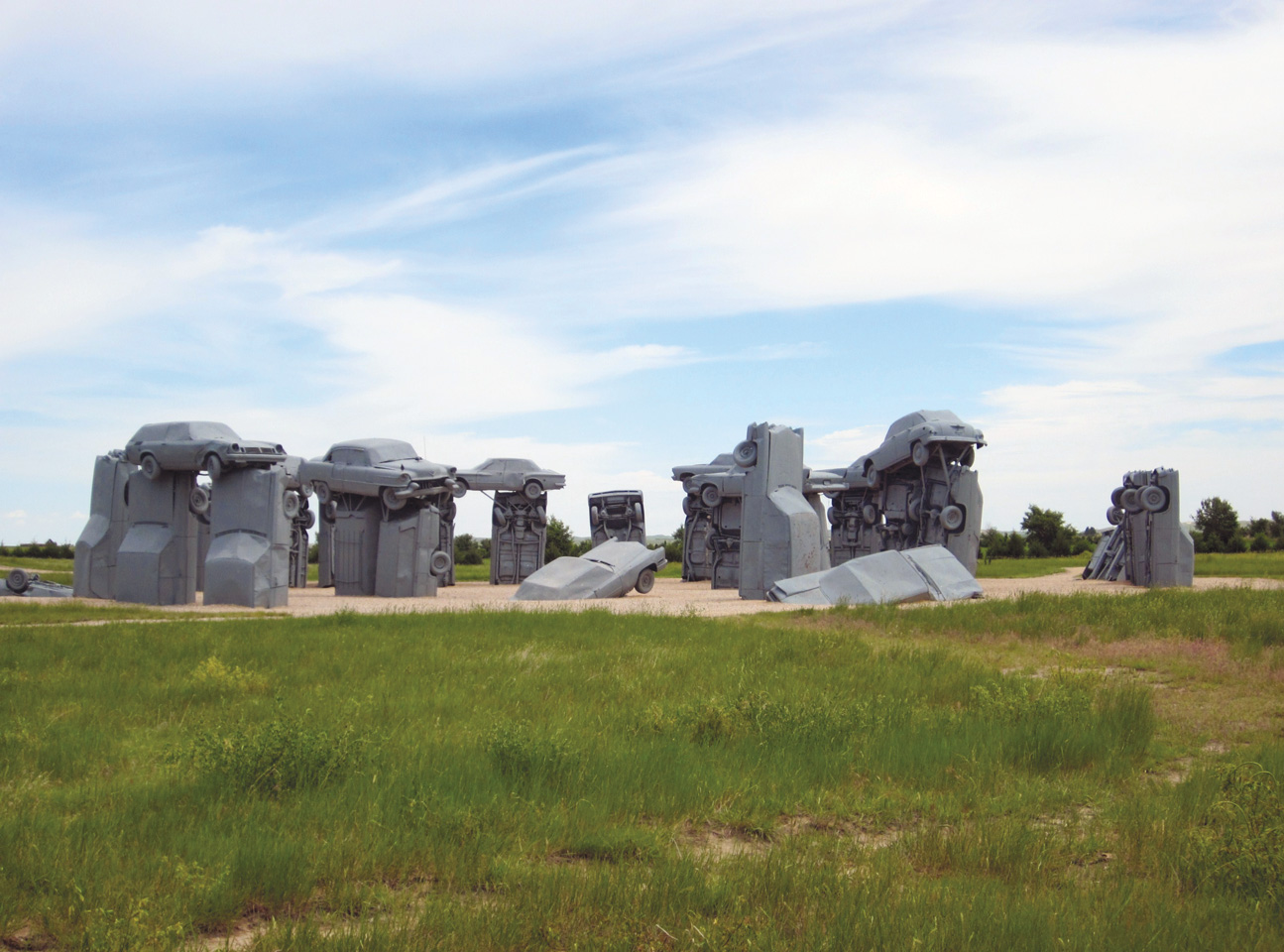 A 1950 Plymouth De Soto precariously spans a 1965 Buick Estate Wagon and a 1975 Ford Country Squire, trilithon-style; a 1959 Pontiac Star Chief serves as a circle stone; and a 1966 Dodge pickup truck juts from the ground at an odd angle to resemble one of the dislodged stones at the original Stonehenge. Nearby, a 1962 Cadillac depicts the heel stone. At approximately 7 feet wide, the cars share dimensions with the standing stones at Stonehenge.