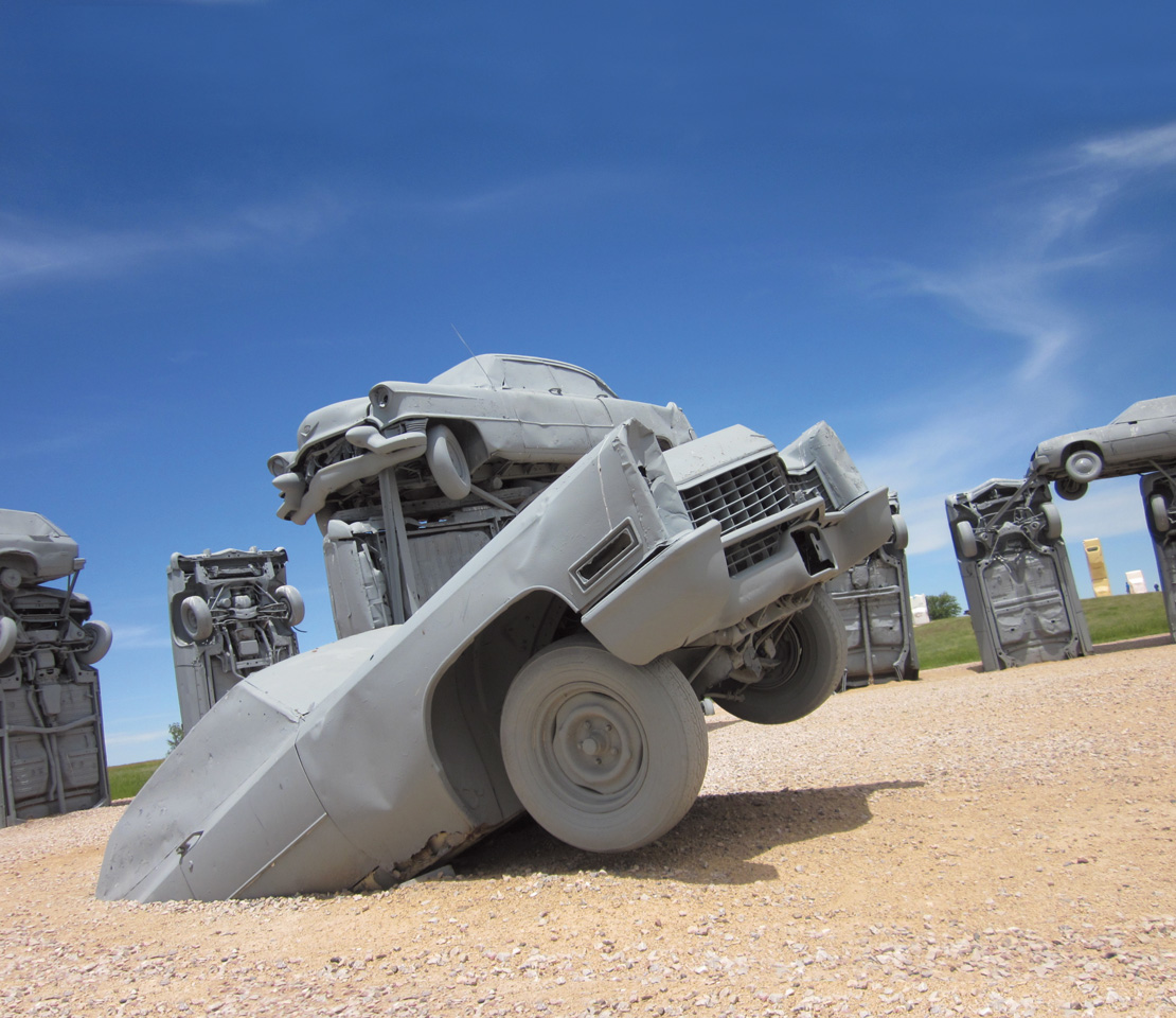 A 1961 Cadillac DeVille emerges from the earth to join other vehicles at Carhenge In Alliance, Nebraska.