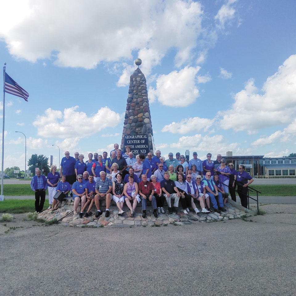 Members of the Ramblin’ Nodaks chapter gathered at the Rugby, North Dakota, monument marking the geographic center of North America (above) and visited a bison herd (top).