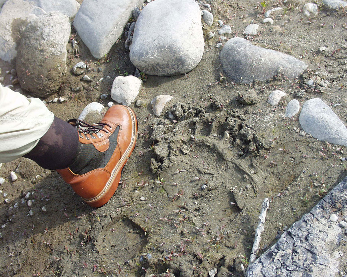Deborah places her foot next to a grizzly bear track on the banks of an Alaska salmon stream.