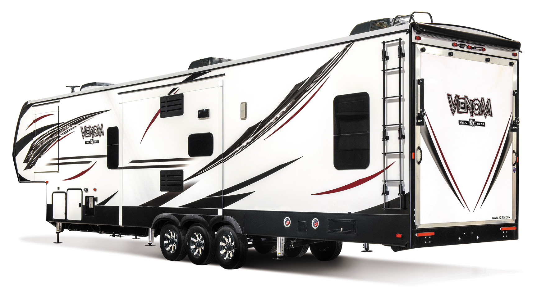 The KZ Venom model is a luxury fifth-wheel toy hauler; it blends a large garage area with a well-featured, upscale living space. The strong, durable RV is chock-full of features that make it a true all-season home on wheels. The high-end Venom is available in four floor plans. The review unit was the V4012TK, a triple-slideout floor plan.