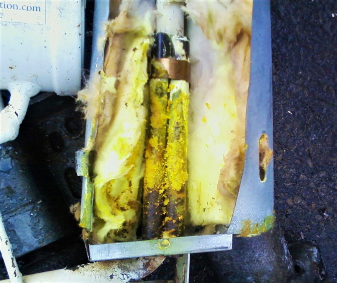 A strong ammonia odor and the presence of a yellow residue indicate an ammonia leak in the exposed tubing of a refrigerator cooling unit.