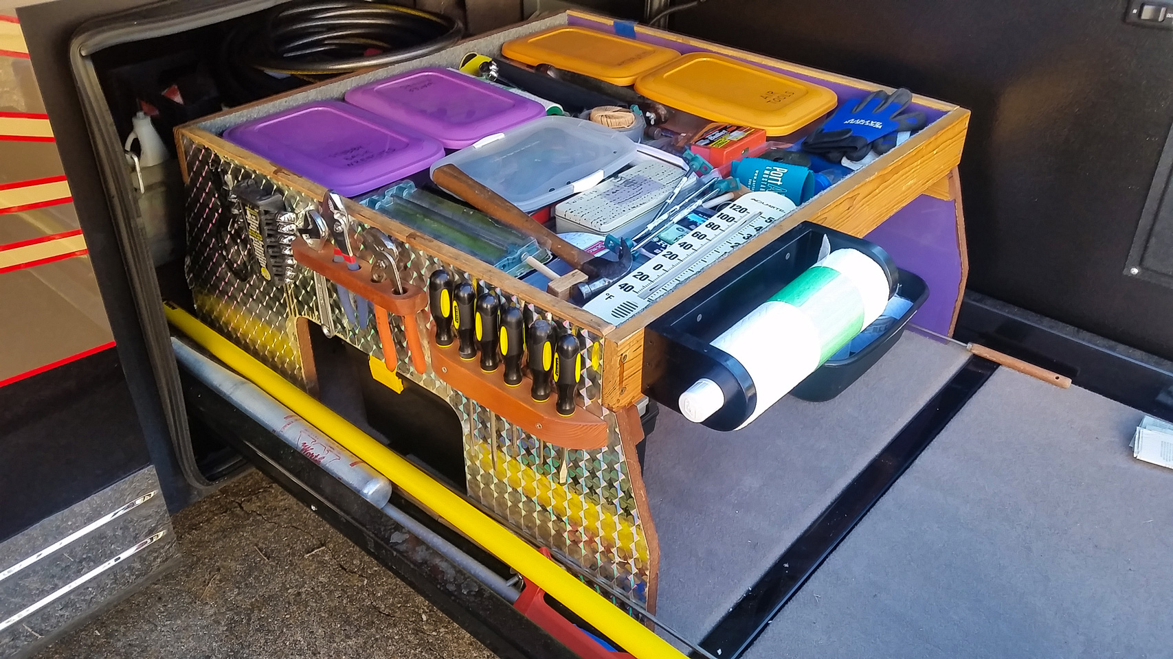 Small items often got lost in my RV’s basement storage compartment. So, I built a platform/storage tray to keep things organized. The tray was made using 1×4 lumber and ½-inch plywood. Frequently used tools are mounted on the side for easy access. The tray bottom is lined with indoor/outdoor carpet to minimize the shifting and sliding of contents. If you make such a platform, be sure its height can clear the RV chassis frame when the compartment is closed. Also, mount the platform in the middle of the cargo tray to ensure the weight is distributed evenly.