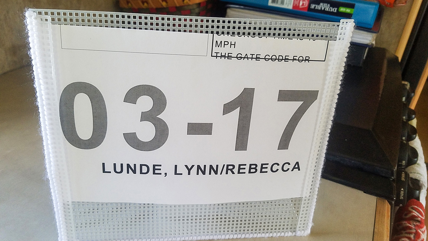 campground departure date holderMy solution was to create a paper holder with an easel back. I used plastic canvas and yarn. Plastic canvas, also known as vinyl weave, is lightweight plastic with regularly spaced holes, resembling embroidery canvas. It’s available from online retailers, as well as craft and hobby stores.