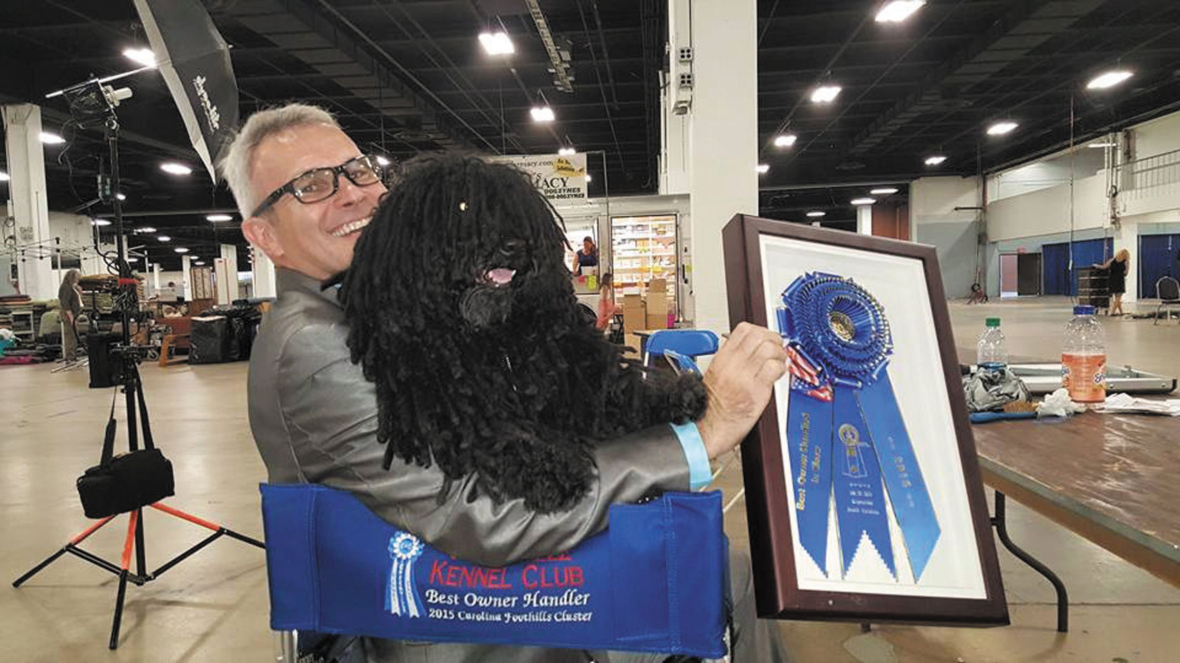 Glen and Blu seem equally proud to display one of their blue ribbons. RVing makes the dog show circuit easier for both humans and canines.