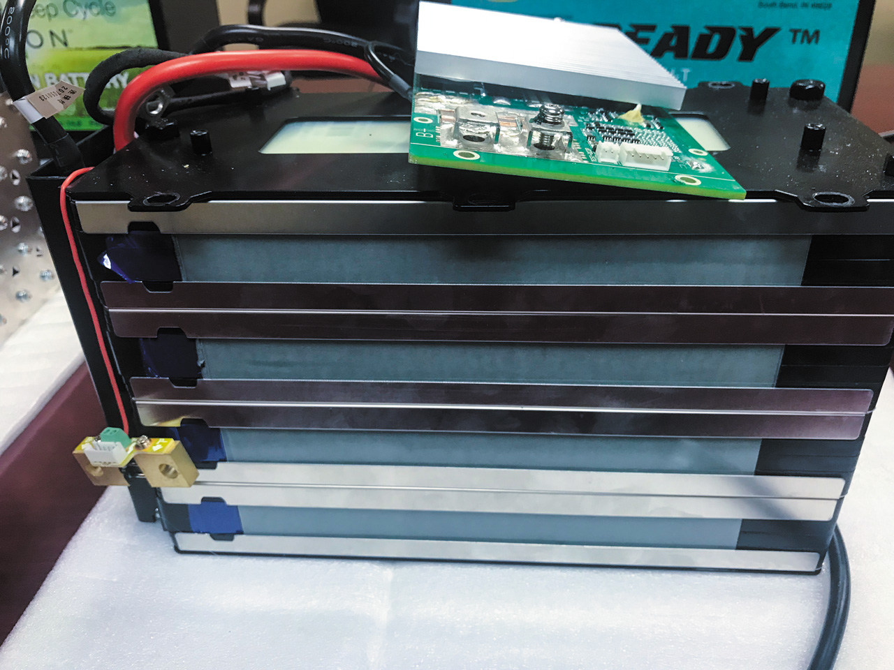 A Briter Products lithium-ion battery with horizontal prismatic cells and torqued connections designed to withstand the bouncing of an RV.