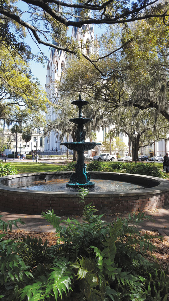 John and Linda Farmer enjoyed a spring day in Savannah, Georgia’s historic district; shown here is Lafayette Square, with the Cathedral Basilica of St. John the Baptist in the background.