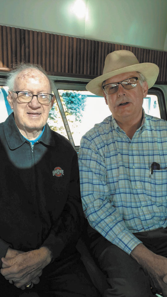 In 2019, Kirwan Elmers (left) and Mike Middaugh went for a November ride in Mike’s 1957 Flxible Starliner, the type of bus used for conversions when Custom Coach opened in 1955.