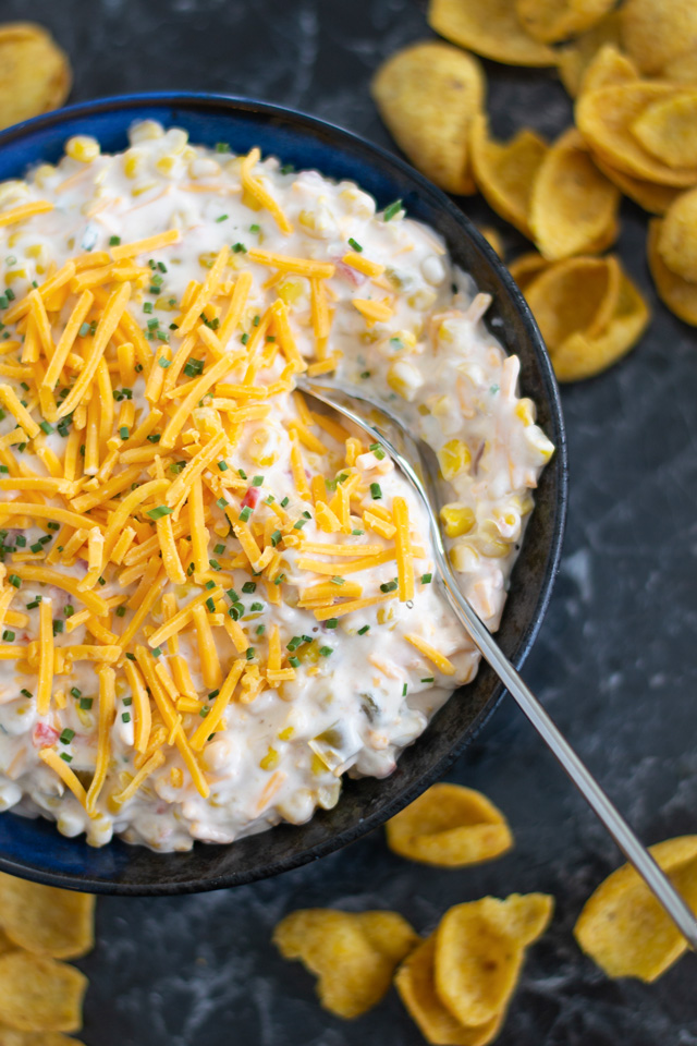 Alternate method: Cook and drain 3 cups of whole-kernel corn, fold the corn into the dip, and scoop up with tortilla chips.