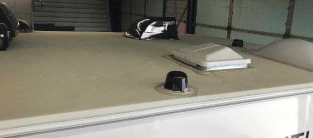 Crawl around the entire roof, carefully inspecting all seals, including perimeter and accessory sealants. Look for cracks, voids, failure or lifting of the sealant, or any other defects that may affect the sealant’s ability to keep water from penetrating. Remember to check the ladder mount and roof-rack seals, as well as clearance lights, air horns, vents, skylights, antennas, etc. Also check for depressions, softness, bubbles, or any other deformity or defect in the roof membrane itself. If these exist, avoid walking or crawling on the damaged area, as they likely indicate a weakened roof deck. This should be checked and repaired by a professional. If you found signs of moisture during the interior inspection, pay particular attention to the roof around the area of the water intrusion, although water can propagate quite a distance and change course several times, so the entry point may be a distance away.