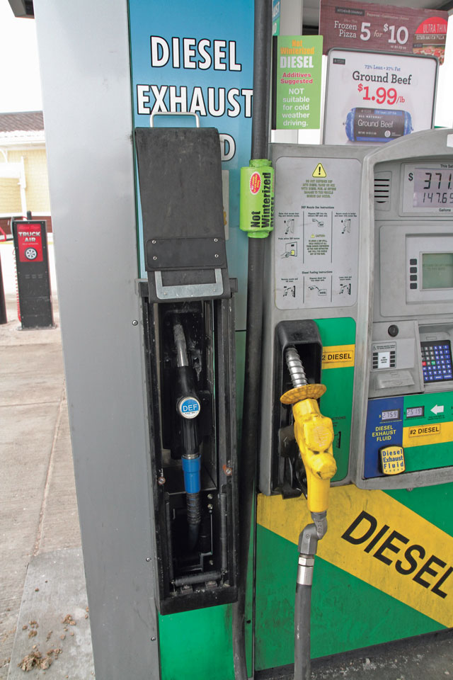 At fuel stations, the DEF pump usually is next to the diesel fuel pump. This DEF pump’s rubber flap is open, showing the nozzle.