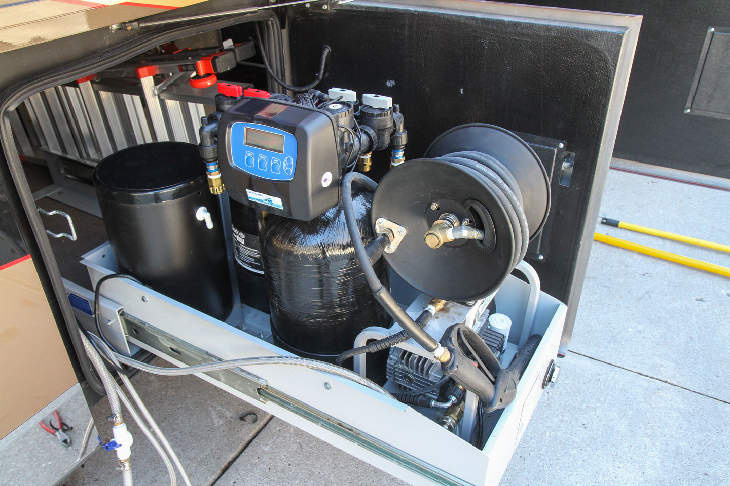 The author’s setup in his motorhome includes a water softener, a brine tank, and a deionizer housed in a slide-out tray behind a Road Wave pressure washer.