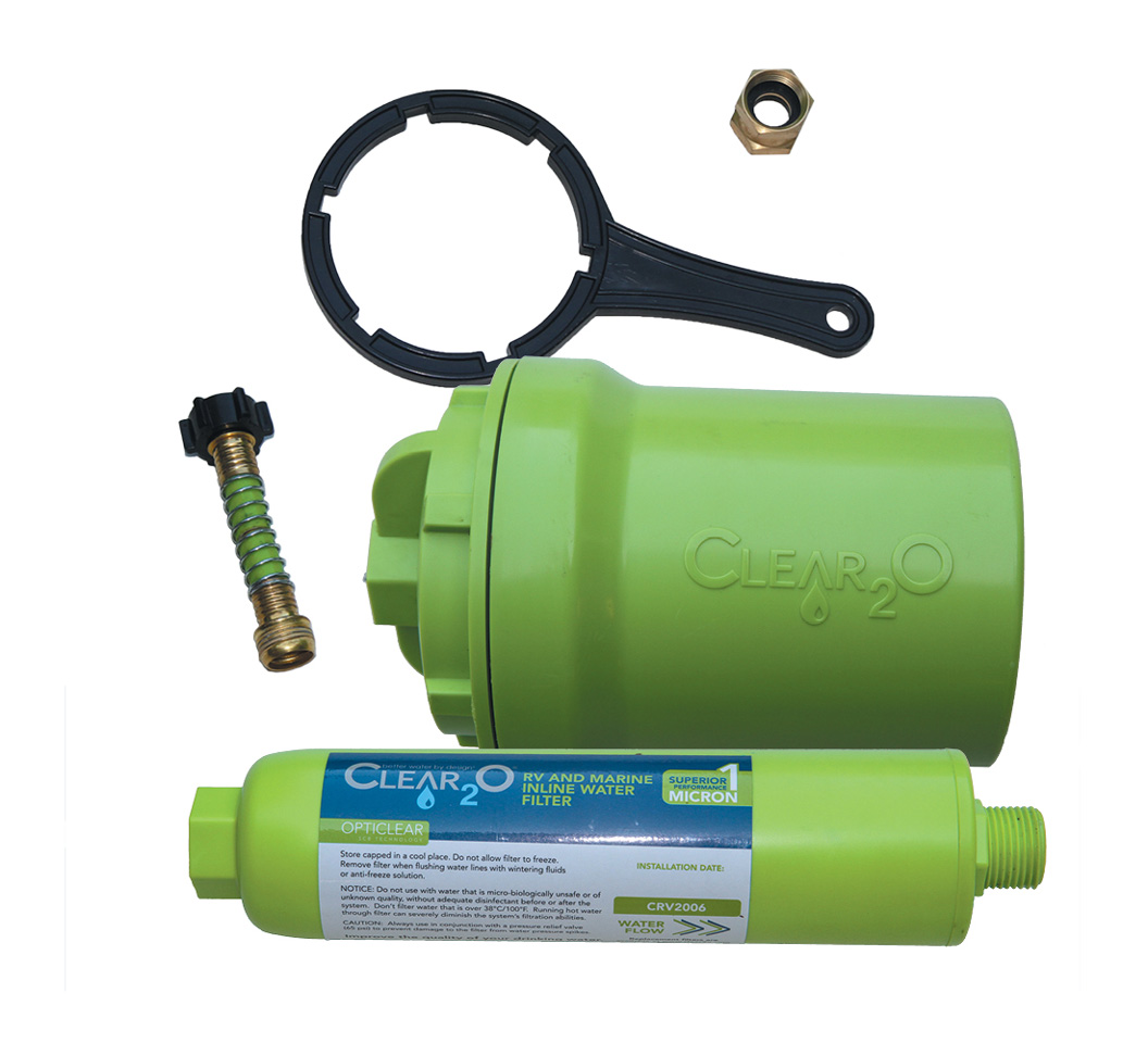 The Clear20 system includes a prefilter, in-line filter, filter wrench, hose extender, and backflush valve.