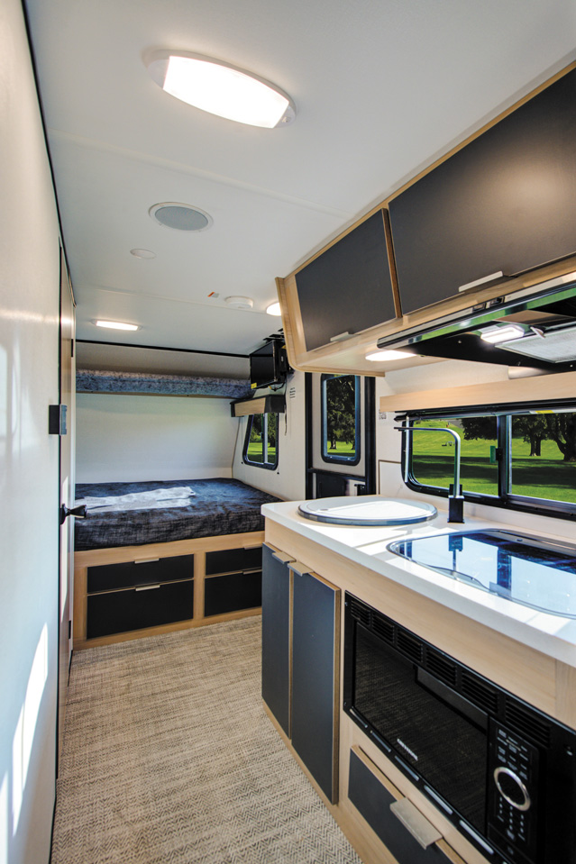 Four floor plans are available. Models range from approximately 18 feet to 22 feet long, with weights from 3,500 to 4,000 pounds. The travel trailer is built using an all-aluminum superstructure, Azdel composite walls, and plywood floors. Features include European two-toned designer cabinetry, 15-inch tires, and torsion axles. Among the amenities are a solar package, Wi-Fi, stainless-steel appliances, and full-size beds.