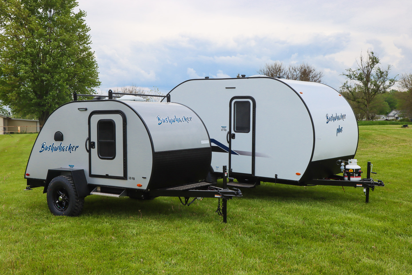The Bushwhacker teardrop trailer, left, and its larger sibling, the Bushwhacker Plus.