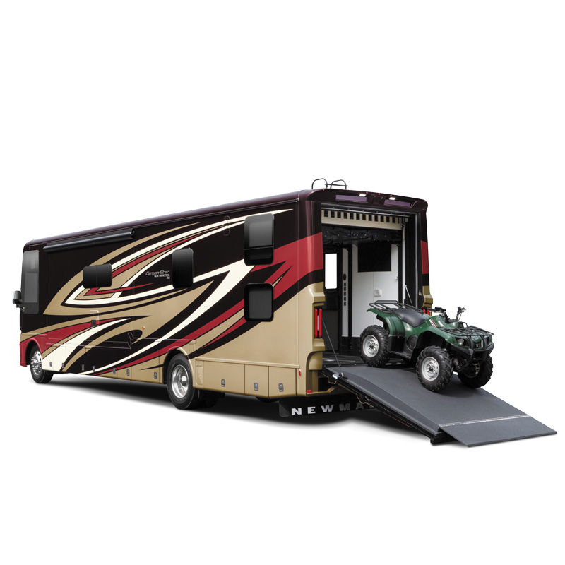 With the ramp down and the optional power screen door lowered, the garage makes a great spot for coach occupants to sit and take in the outside view. The ramp raises to seal up the garage. A side door allows easy entry to or egress from the garage area, as well as to the interior door that leads to the main bedroom.