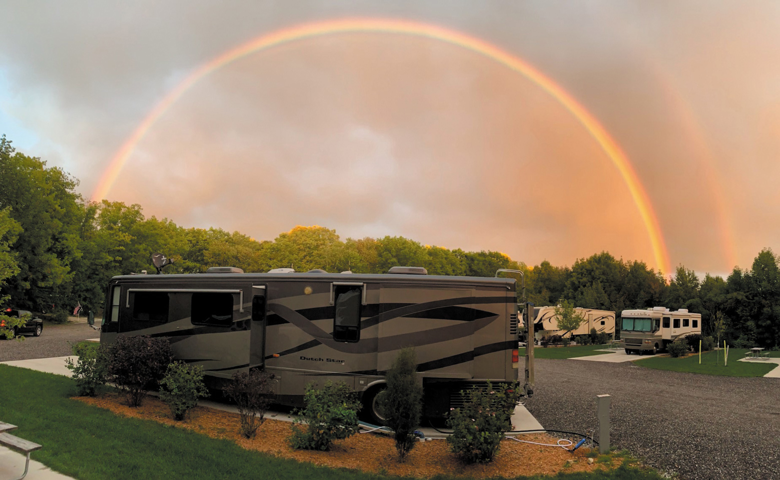 During a stay at Egg Harbor Campground & RV Park in Door County, Wisconsin, Kurtis Kindschi witnessed this rainbow that seemed to embrace the campground.