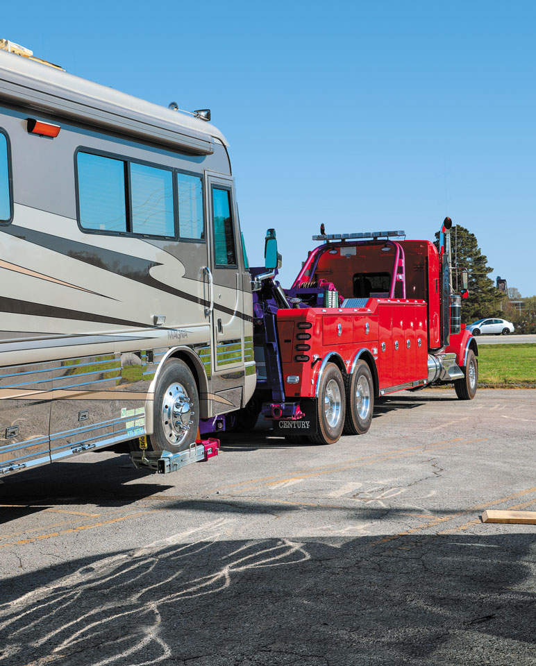 The most secure method for towing a motorhome is with a wheel lift, as shown here.