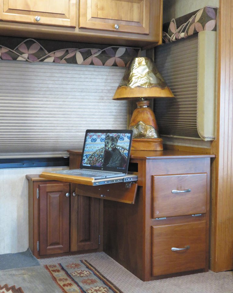 Davidson RV’s craftspeople added a custom corner workstation made of cherry wood to the author's motorhome.