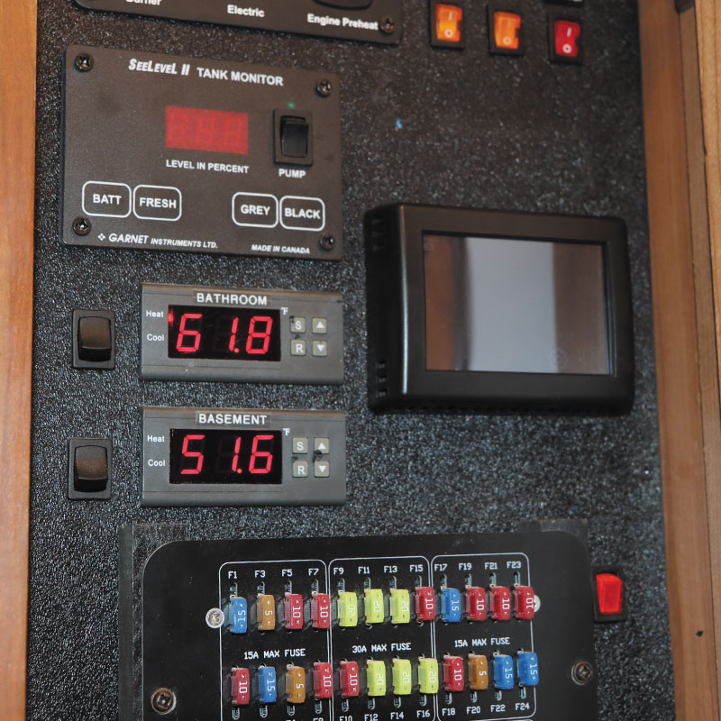 The EasyTouch touchscreen thermostat (right center) occupies the same spot as the author's original thermostat in a cabinet with other electric controls.