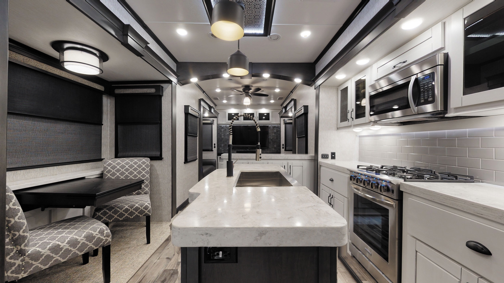 A half wall topped with a buffet counter divides the galley from the living area at the rear of the unit. The final two slideouts are positioned here, opposite from each other; both hold a 72-inch tri-fold sofa that can be converted to sleeping space at the same time, with room to spare between them. Theater seating with electric controls rests against the buffet wall. All three seating areas are within view of the 65-inch 4K Smart HDTV on the back wall.
