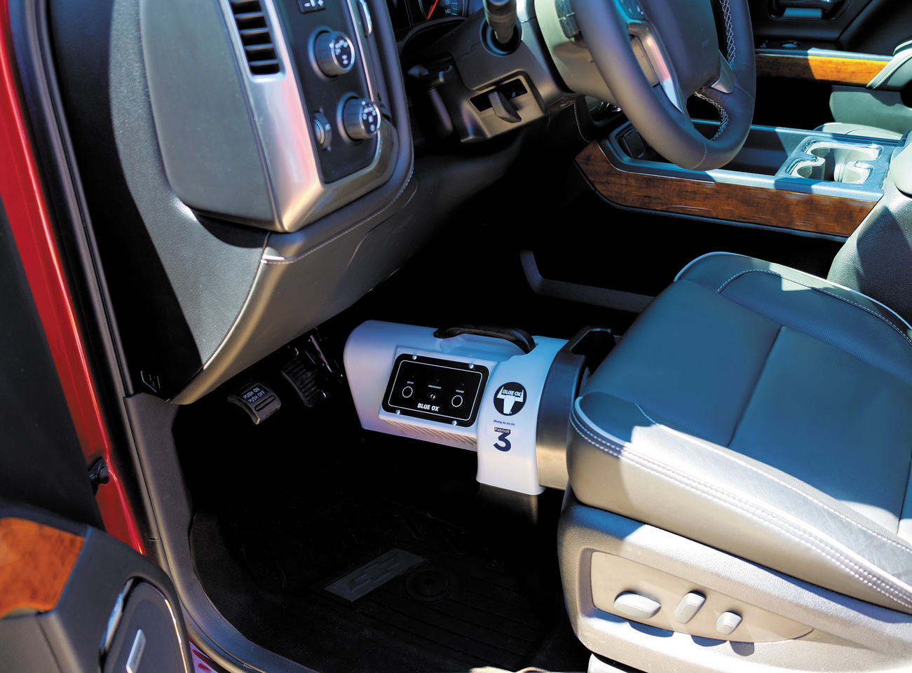Portable supplemental braking systems, such as this Blue Ox model, rest on the floor of the towed vehicle.