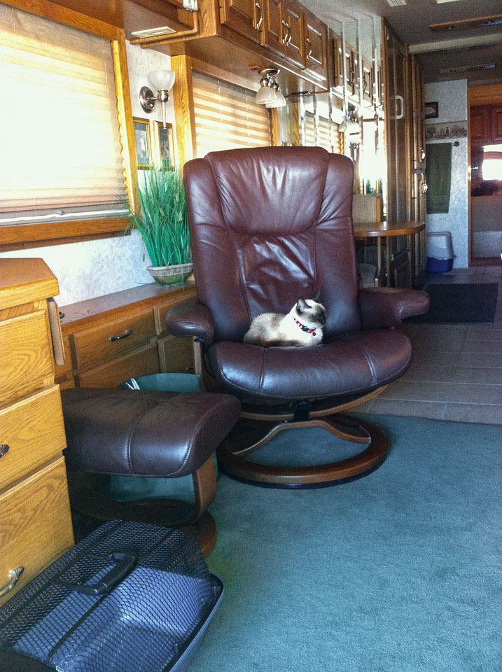 Today, Sweetie is content to stay in the coach. She sleeps on the dashboard next to the windshield or on the bed in the rear, where she looks out the window and entertains people passing by. She loves to be close to me, purring and being petted. She is the perfect travel companion.