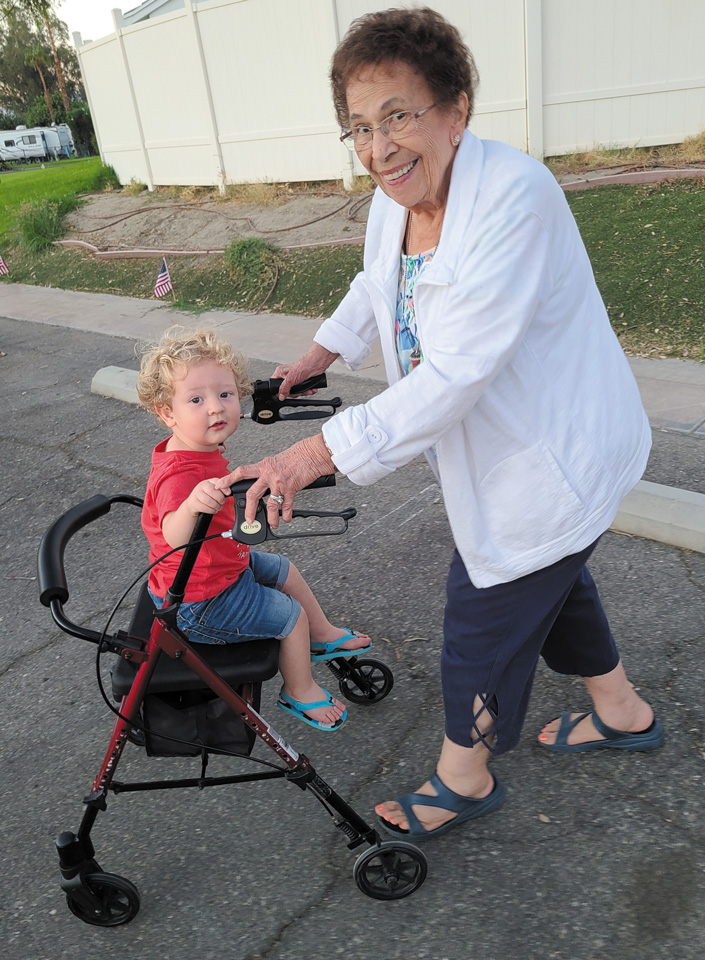 Lorraine Brickaway, the oldest member of the Camping Squares chapter, gives the youngest member a ride.