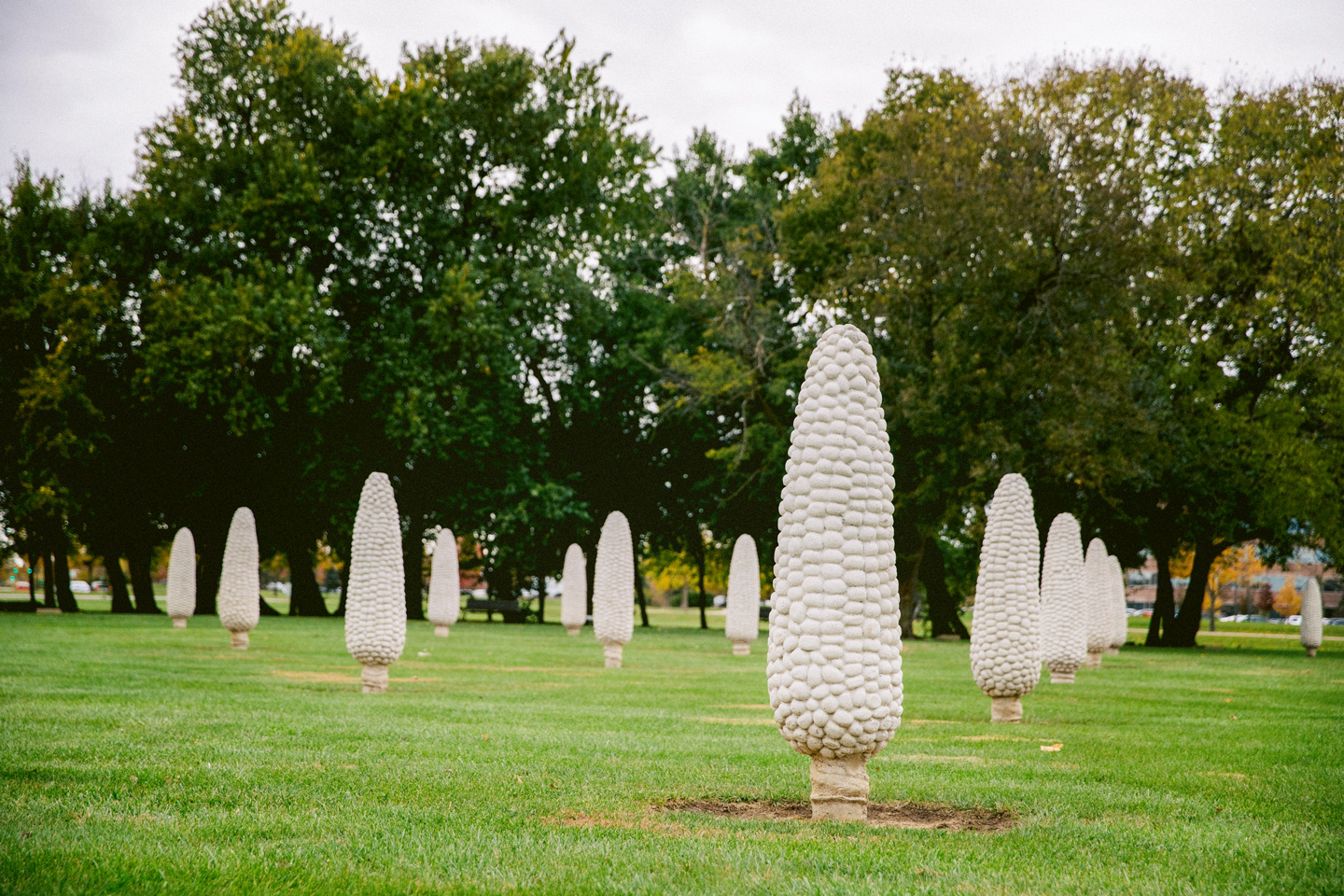 Cochran’s creation features 109 human-sized ears of white corn arranged row by row in a field of grass — an homage to the area’s agricultural heritage. The concrete ears stand 6 feet 3 inches tall and weigh 1,500 pounds apiece. Each is secured atop a 3-foot-deep hole filled with concrete. Three full-size prototypes were created as molds, each with different kernel patterns; the finished ears were installed in varied orientations to further replicate the randomness of nature.