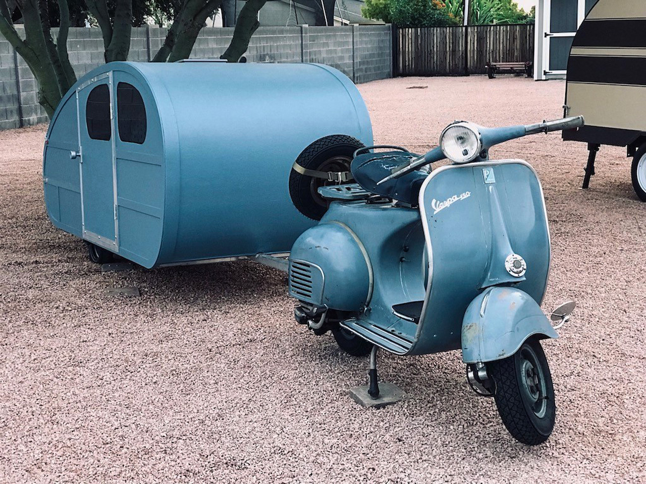 Using it can sometimes be a challenge, because it is towed by a 60-year-old scooter. I try to find camping spots within a 10-mile radius of my home in Mesa, Arizona. I look for farm pastures, open fields, and any other local spots where I can get permission to stay. I recently designed an elaborate trailering system for my truck. I carry the Vespa on the front bumper and winch the teardrop up on the bed. That way I can take them anywhere in the country.