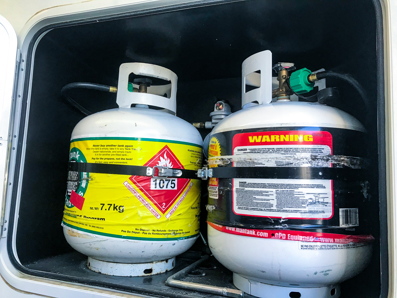 Towable RVs generally include portable propane cylinders, with specific locations to secure the containers. They should be in an upright position in the RV, even while not in use, to maintain correct pressure, prevent liquid propane leaks, and avoid damage to the pressure relief valve.