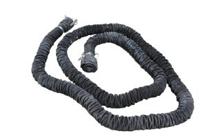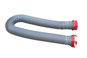 Macerator hoses are smaller in diameter. Unlike a 3-inch sewer slinky hose that uses gravity to dump, this smaller hose is filled by the macerator pump that can move the waste 100 feet or more and uphill if necessary. The original macerator hose was 1¼ inches in diameter, but the newer Sani-Con Turbo from Thetford is much more powerful, has a higher flow rate, and uses a 1½-inch hose. Macerator hoses may be hard-plumbed to the macerator with a sewer adapter and dust cap on the output end, or may be connected with cam-lock couplers to allow for various lengths using extension hoses. Some macerator hoses are equipped with canvas sleeves to help protect them from abrasions.