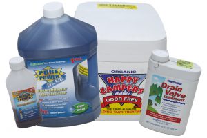 Holding tank treatments that don’t include formaldehyde include Happy Campers, which is a popular dry powder; Valterra Pure Power Blue, an excellent liquid product; and Thetford AquaBio, AquaMax, and Campa-Fresh products. Rid-X, which is commonly used in septic systems, also can be used. Some treatments contain cellulase to break down toilet paper and vegetable matter; lipase to break down fats, oils, and grease; protease to break down proteins; and amylase to break down starches. Note that these products do not dissolve human waste; that occurs naturally just by leaving it covered with water. So, if you allow only human waste and RV-suitable toilet paper in your tanks, you really don’t need chemicals to dissolve your waste.