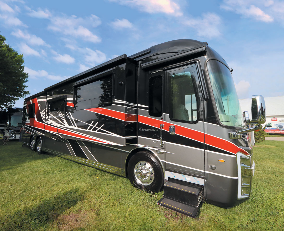 The Cornerstone, Entegra Coach’s flagship model, appears to live up to the company’s pledge to produce the quietest-riding, best-handling motorhomes in the high-line category. Spartan’s recent improvements to the chassis’ front suspension raise the bar further. The new Safe View Dash helps to keep the driver’s eyes on where he or she is going; the new digital technology, 360-view camera, and improved HVAC and defroster technology contribute even more to safety. A choice of floor plans and decors plus a huge number of features will put the Cornerstone at the top of many RVers’ lists.