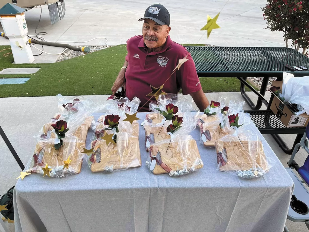 Jerry Allen, Freedom Rollers RV Club president, gets ready to present each family with a memorable token during the chapter’s first anniversary rally.