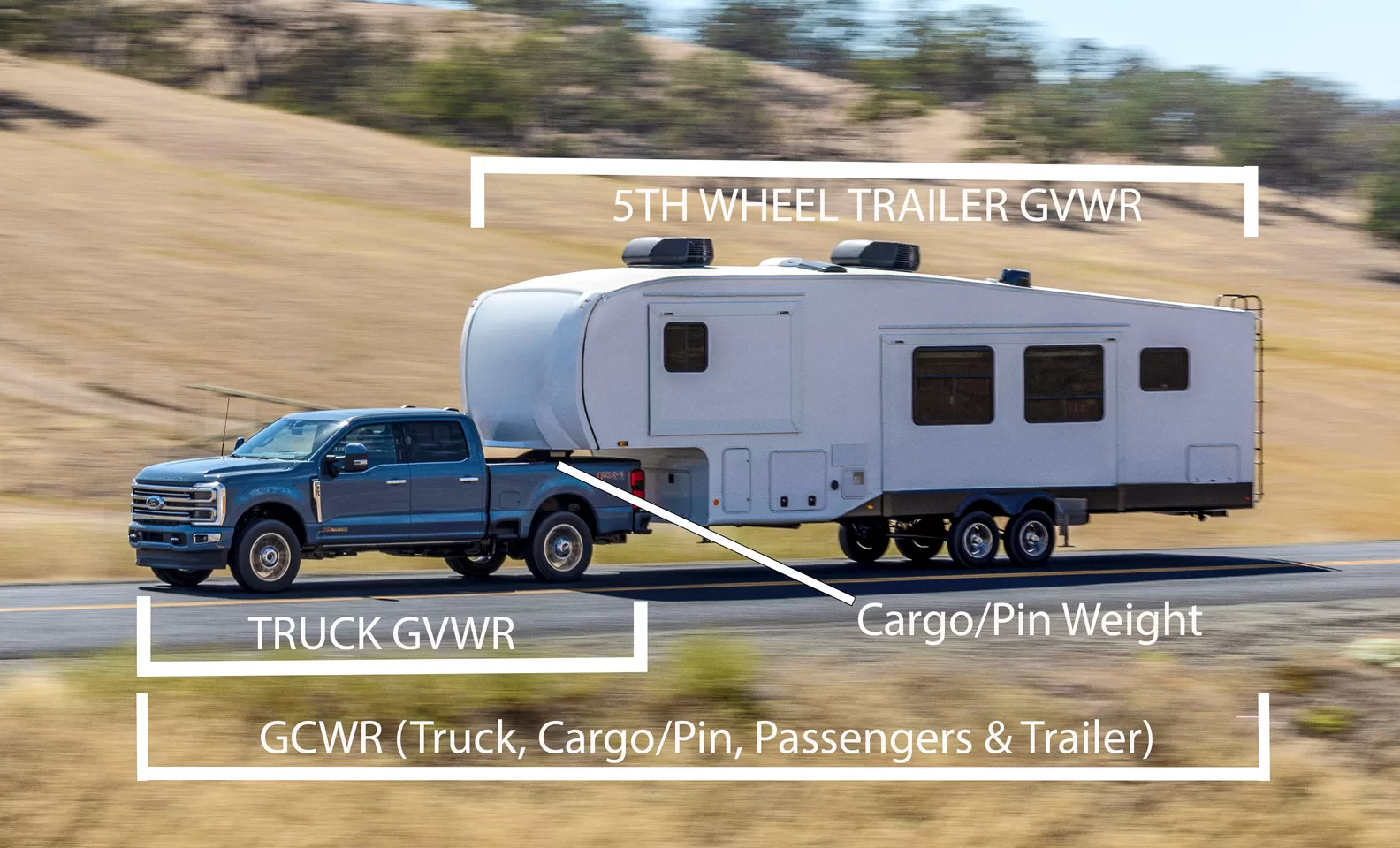 This image visually depicts the relationship between various weights related to towing a fifth-wheel travel trailer.
