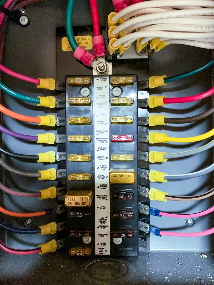 Power for the rest of the onboard low-voltage electrical systems, including lights, water pump, furnace, water heater, and fridge control boards, as well as the monitor panel, comes from the house battery bank. You may have other loads in your RV. Each load, or set of loads, requires its own dedicated and protected circuit, so the large battery cables will feed a distribution panel (which may be incorporated into the converter). This panel will consist of a series of fuses that protect each branch circuit. It is important to note the location of the RV’s fuse panel, so you know where to look if a 12-volt load stops working.