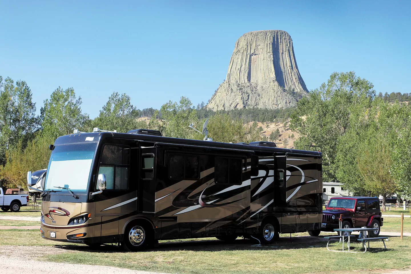 Bob MacLeod and Pam Strickland’s motorhome and towed vehicle seemed to pose for a photo with Wyoming’s Devils Tower at the nearby KOA.