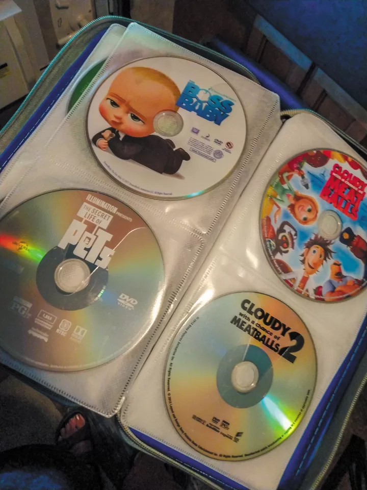 I thought I’d share a tip that helped us gain extra space. Our kids enjoy bringing movies along on our long trips, and we had two bins of DVDs taking up an entire cabinet in the RV. We decided to put the DVDs into a CD binder so we could leave the cases at home. This allows us to bring a lot of movies while taking up very little space.