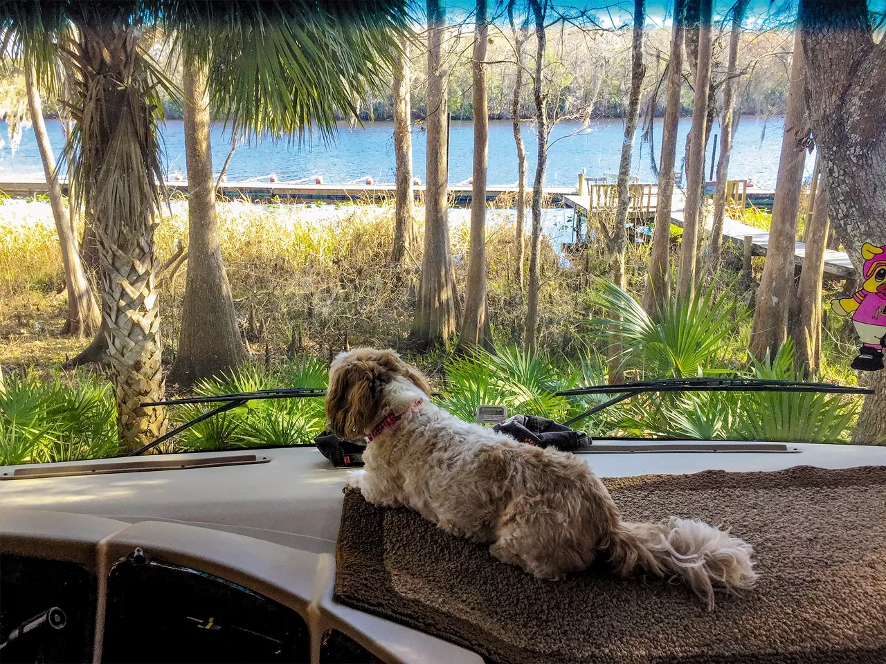 Patricia Hilderbrand and Jack Smyth’s Shih Tzu, Michi, perches on her favorite spot inside their Coachmen Mirada —the dash — when they’re parked.