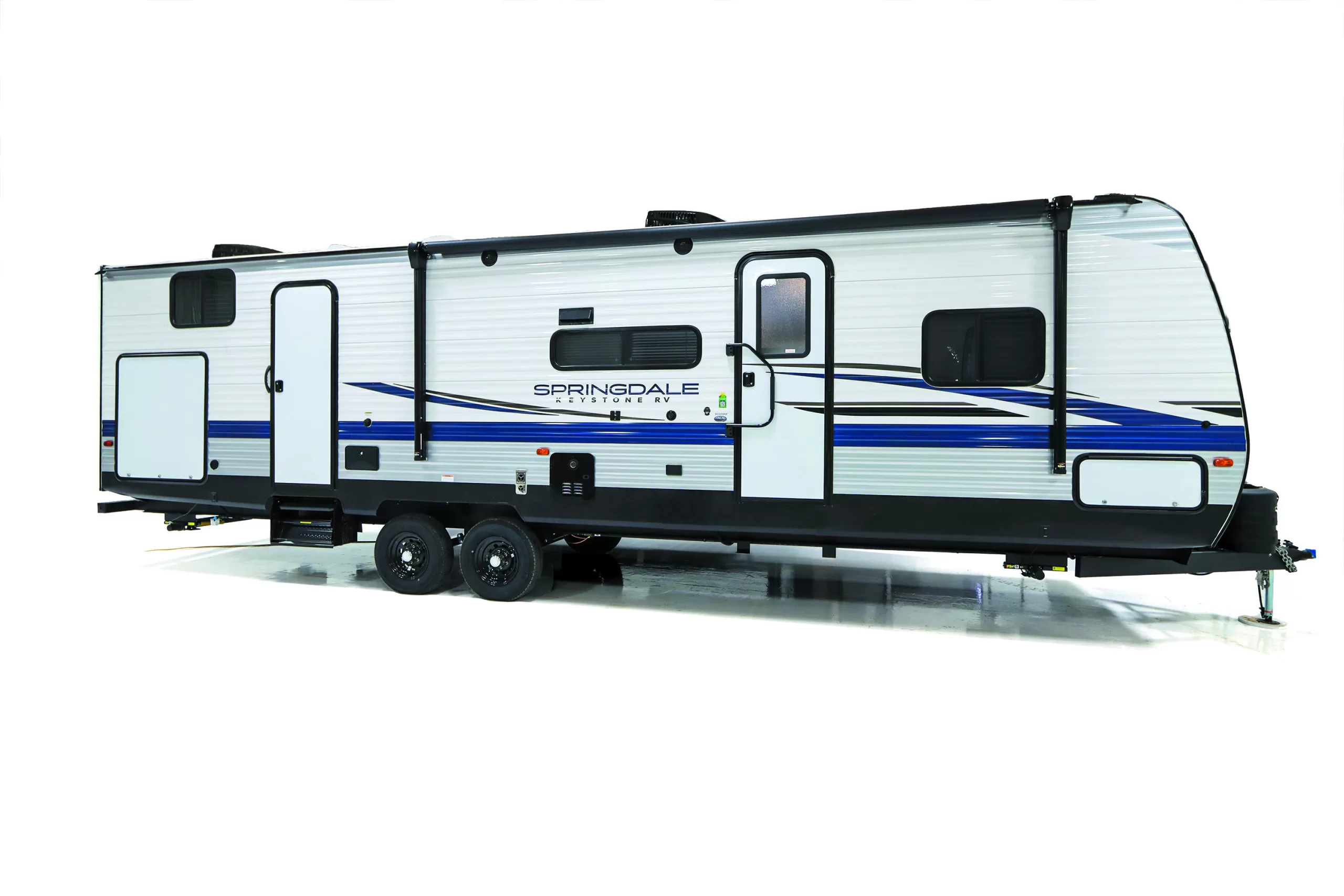 Keystone RV’s Springdale line is a collection of affordable travel trailers that includes everything from 21-foot compact floor plans to 39-foot bunkhouse layouts. For this review, we selected the model 303BH, a 35-foot dual-entry unit with a private bunkroom and two slideouts. And with a sleeping capacity of 10, it’s an excellent choice for larger families.