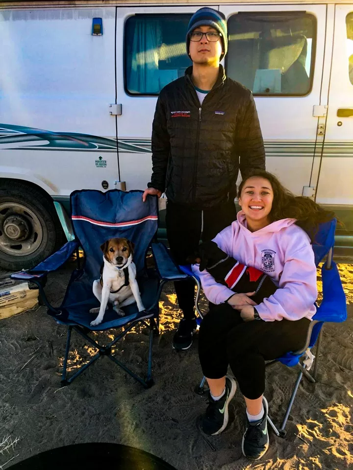 Who said you have to leave your dogs at home? RVing is for the whole family — pets included. Pictured here are Susan (D3); her fiancé, Frank; and their pups.