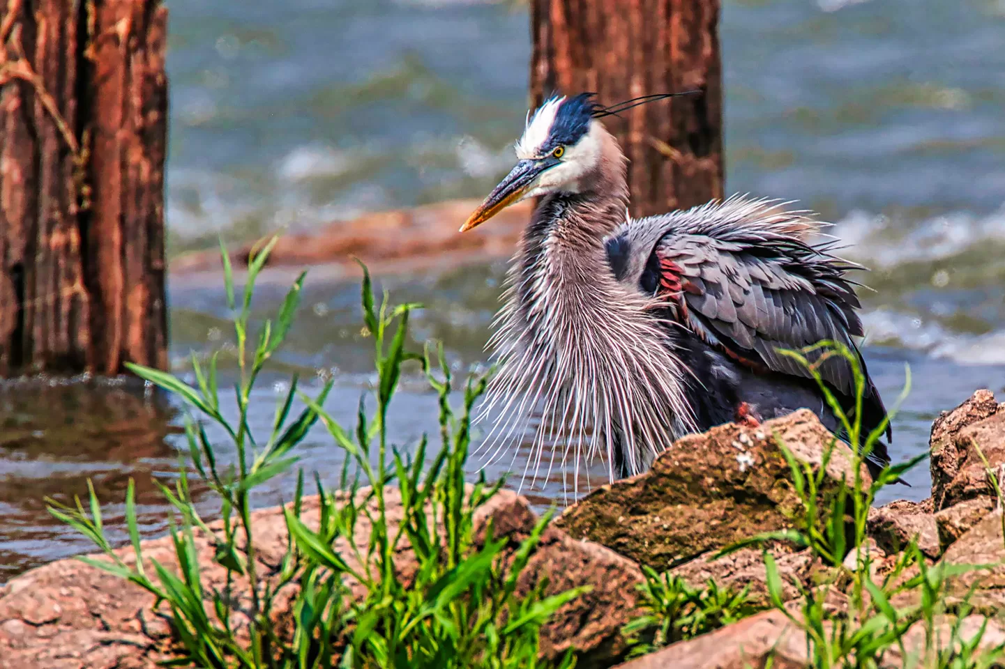While photographing great blue herons fishing in the Red River near Denison, Texas, George Moore spotted one preening nearby and captured the result.