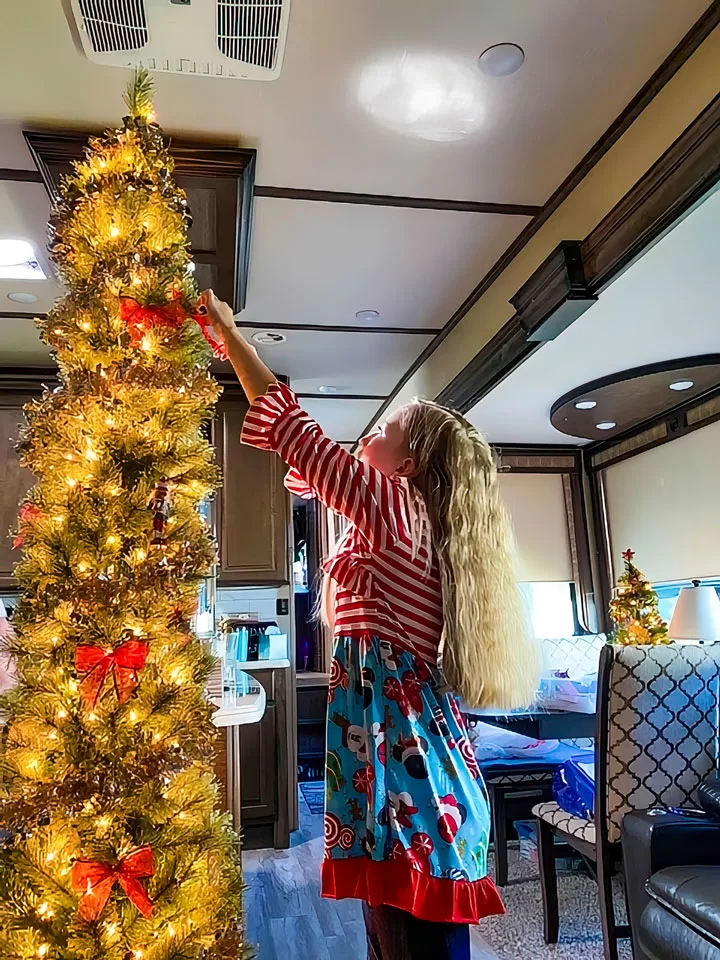 A pencil Christmas tree fits nicely in the smaller confines of an RV.
