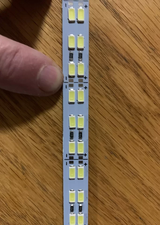 Most LED light strips can be cut to fit the desired location. They must be cut at specific points, however. On the strip above, lines mark the appropriate places.