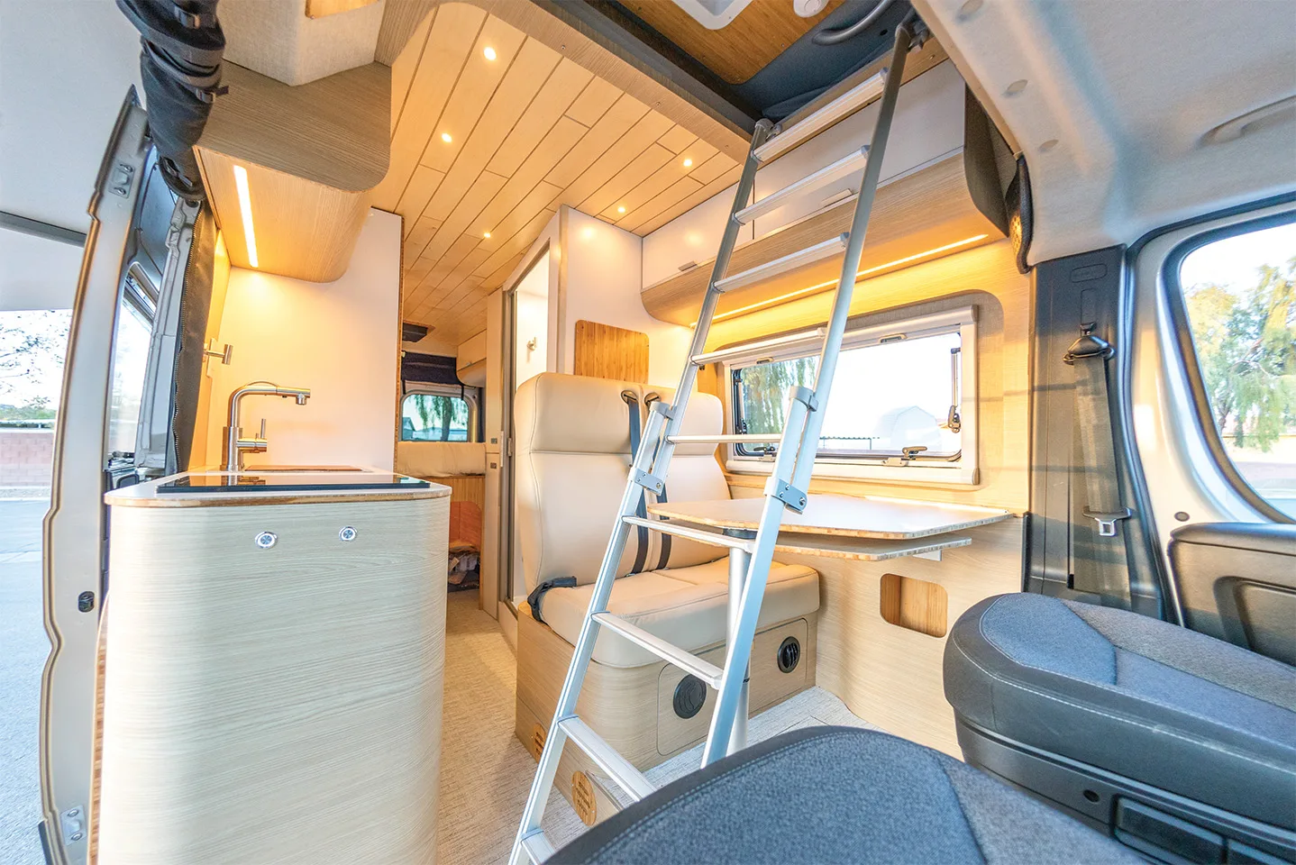 The Noovo Pop is built on a Ram ProMaster van high-roof chassis powered by a 3.6-liter V-6 gas engine. The coach can sleep four with a permanent RV queen-size bed and a pop-up tent addition. Its fully equipped kitchen includes a single-burner induction cooktop, a 12-volt refrigerator, a microwave oven, and a 15-inch-by-15-inch stainless-steel sink. A private bathroom features a full-size high-pressure shower and a built-in Thetford cassette toilet. The coach comes with a roof air conditioner, an on-demand gasoline-powered hydronic furnace and water heating system, and 40-gallon gray- and fresh-water tanks.