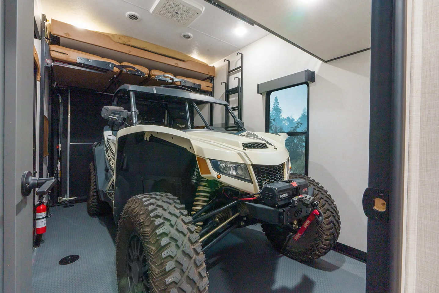 The Sportster X is said to be “the ultimate toy hauler” for those with larger UTVs, providing garages that range from 11 feet to 15 feet, and built to accommodate both the length and weight of the largest toys on the market. The redesign began at the chassis and continued to the roof, resulting in a modern look that elevates form and function. Storage was a top priority, and the new units feature triple-entry pass-through storage areas that are outfitted with a felt-lined finish, powder-coated storage shelves, LED light strips, and slam latch cargo doors.