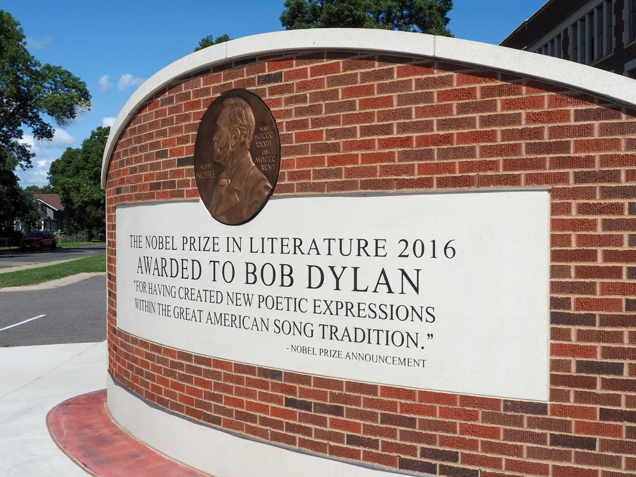 Hibbing, Minnesota, pays tribute to musician Bob Dylan, its most famous resident, with a display wall in front of the high school where he graduated in 1959.