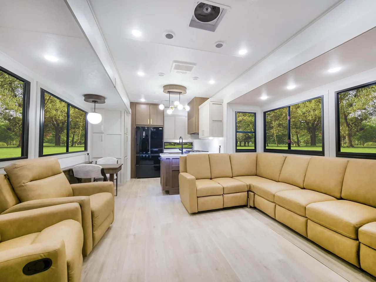 Expansive, reflective windows with square corners give the new Denali fifth-wheel RV a contemporary look — both inside and outside.