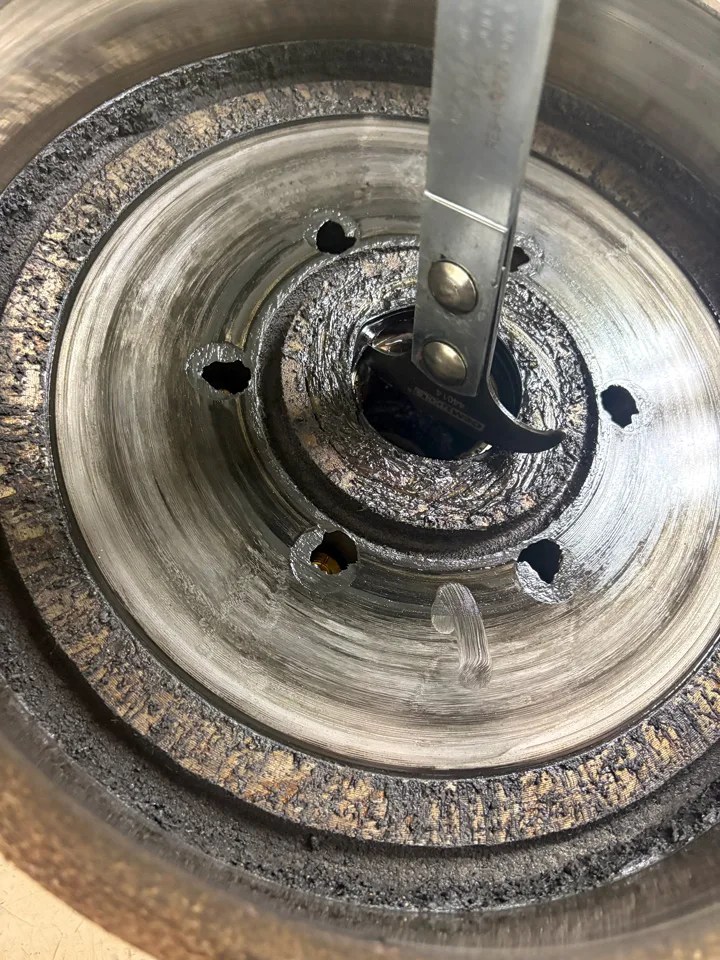 The final step of this phase of the procedure is to use a seal puller to remove the wheel seals from the drum. This tool can be obtained very inexpensively from an auto-parts store. The wheel seals, which look like washers, hold the inner bearings in place inside the drums. Usually, the seals come out quite easily with a few tugs of the bearing puller. Remove the inner bearings and place them with the other separated parts.